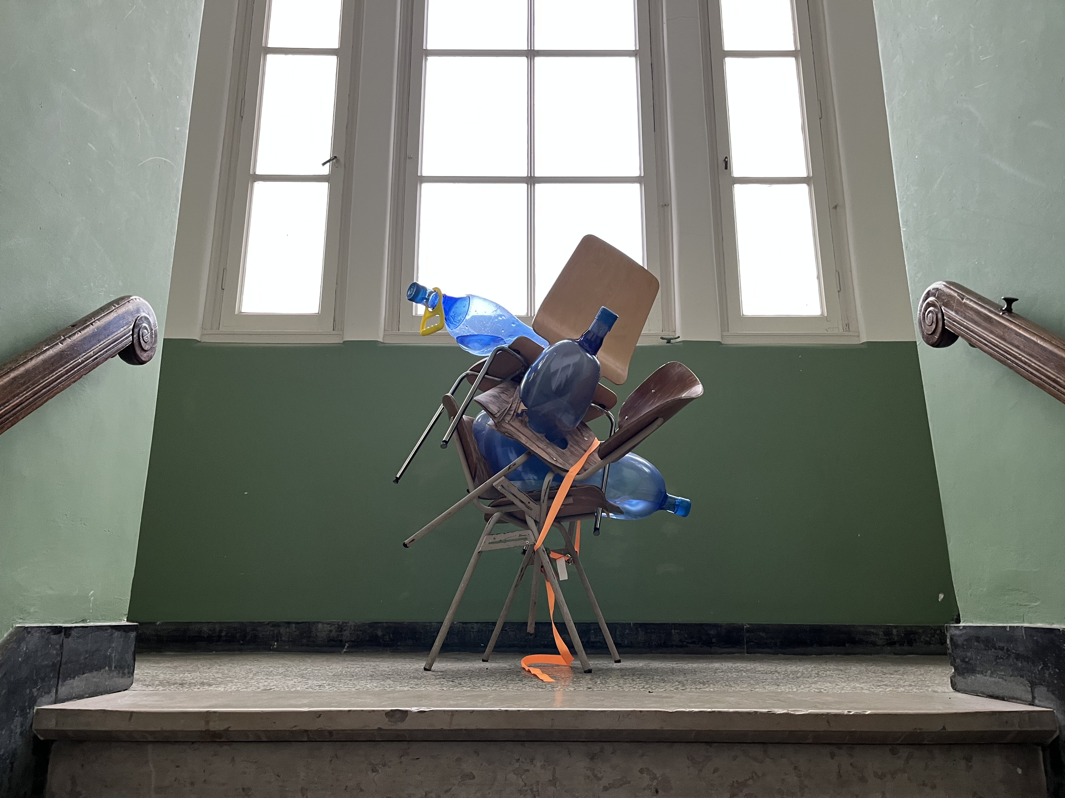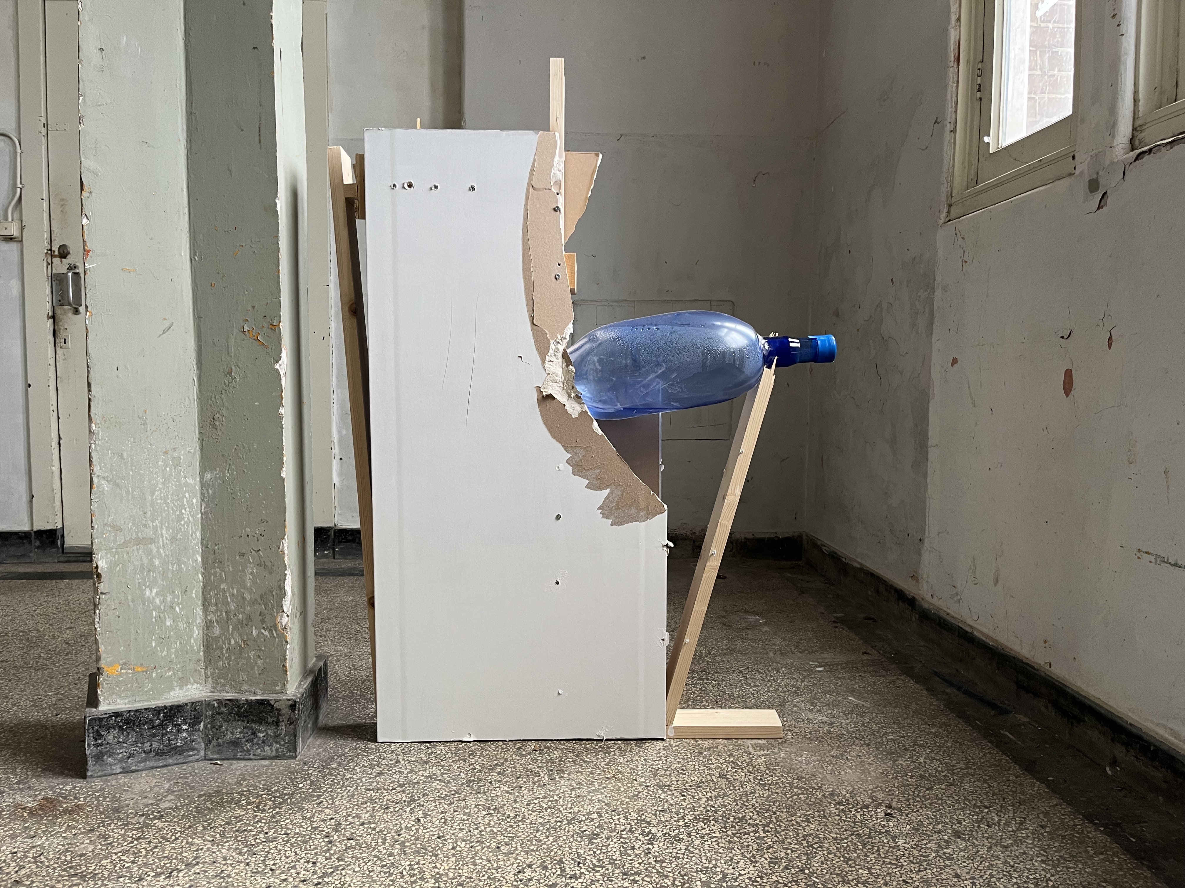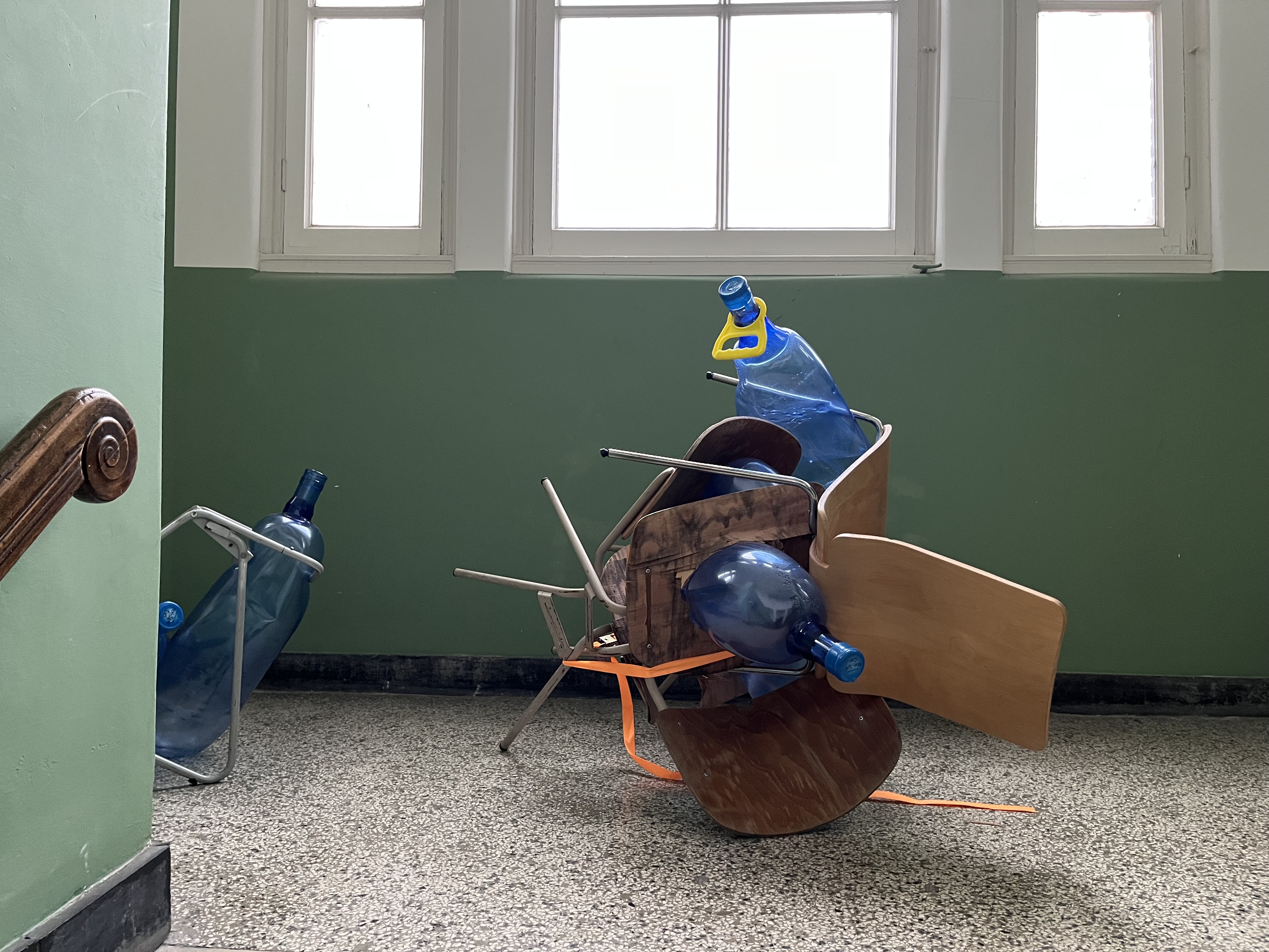 Work-in-progress (PET 5-gallon water bottle preforms, water, air, found institutuional architectures)