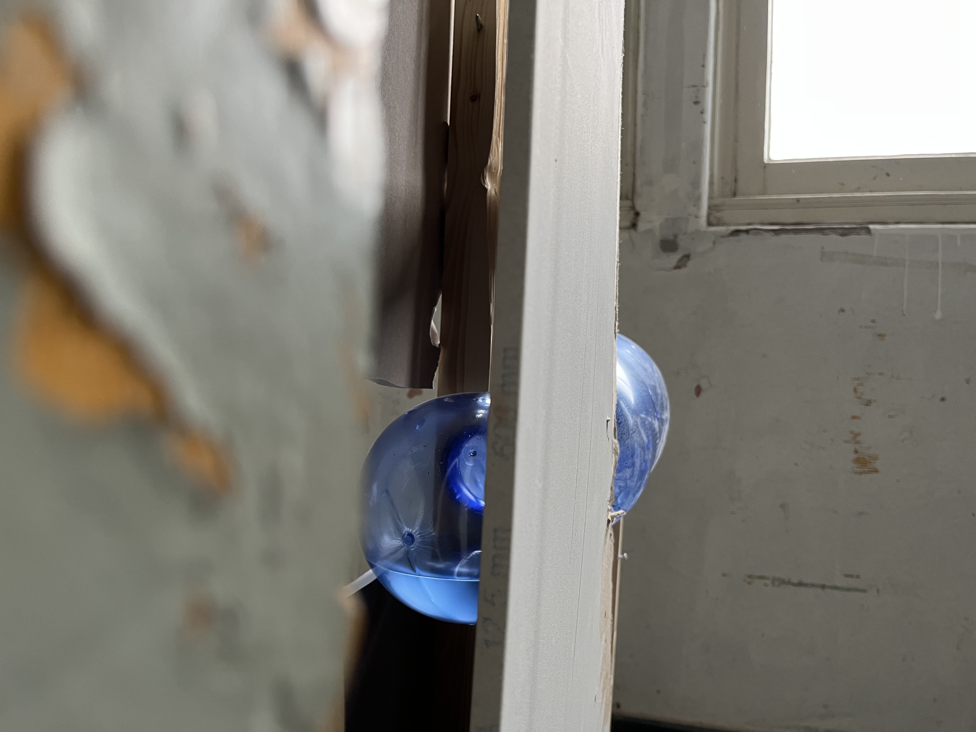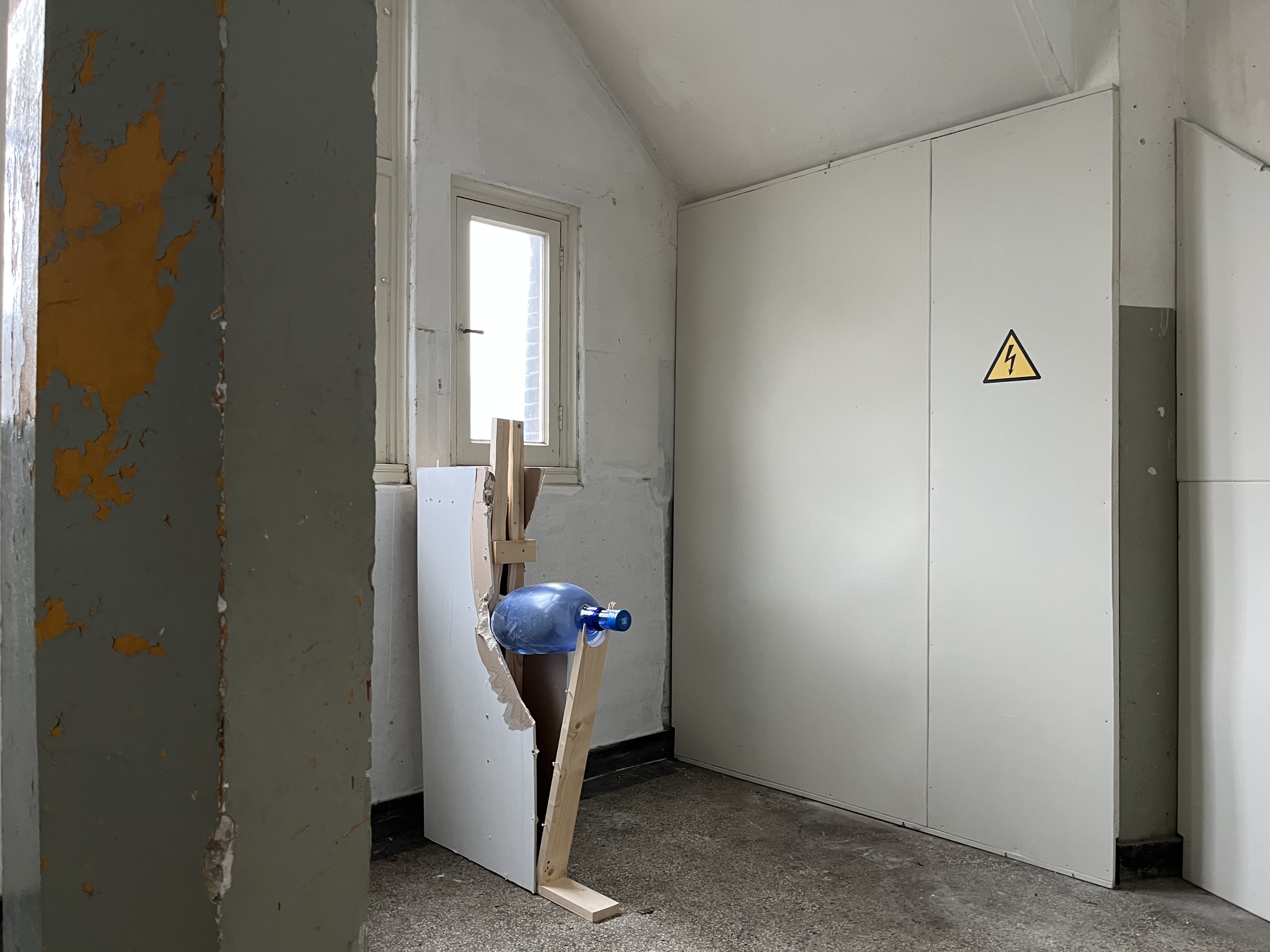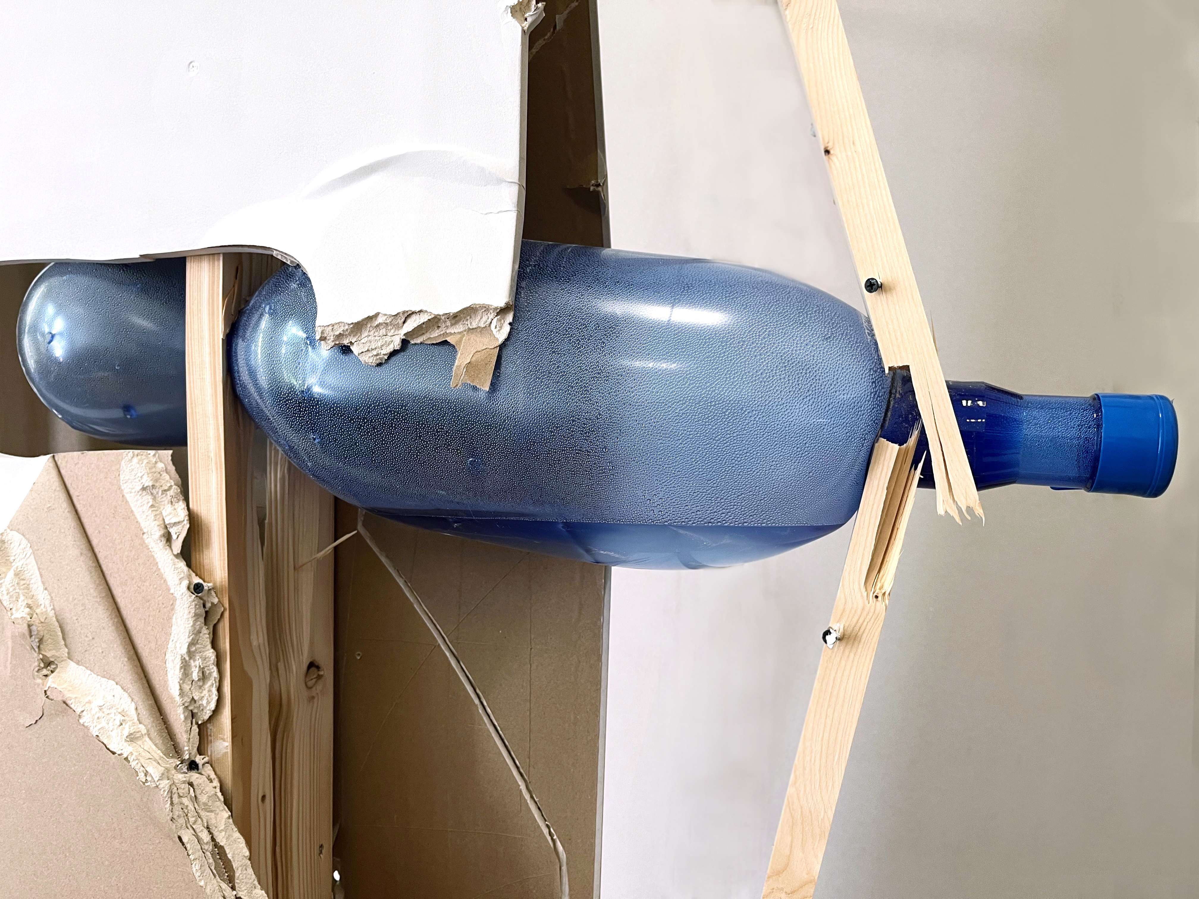 Work-in-progress (PET 5-gallon water bottle preforms, water, air, found institutuional architectures)