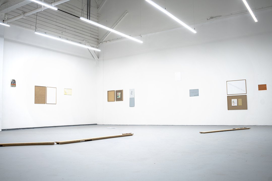 The given elements of the exhibition are: a roughly square gallery space with a garage door (approximately 34’ x 38’ feet, or around 1500 square feet, of floor space, with an estimated 24’ maximum ceiling height with an estimated 30 degree slope); and fluorescent lights. Within the exhibition space are a small sculptural installation and drawings.